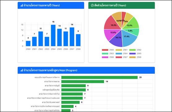 งานวิจัยนี้มีจุดประสงค์เพื่อออกแบบและพัฒนาระบบสารสนเทศสำหรับการบริหารจัดการพื้นที่บริการวิชาการของคณะบริหารธุรกิจและการจัดการ มหาวิทยาลัยราชภัฏอุบลราชธานี เพื่อแก้ไขปัญหาการจัดการข้อมูลที่ขาดประสิทธิภาพและเป็นระบบ ซึ่งนำไปสู่ความยุ่งยากในการบริหารจัดการและการวางแผน การวิจัยนี้ใช้ระเบียบวิธีวิจัยเชิงพัฒนาตามกรอบแนวคิดปัจจัยนำเข้า-กระบวนการ-ผลลัพธ์ (Input-Process-Output: IPO) และวงจรการพัฒนาระบบ (System Development Life Cycle: SDLC) ในการดำเนินงาน ผลการศึกษาได้พัฒนาระบบสารสนเทศที่สามารถรวบรวม, จัดการ, และแสดงผลข้อมูลกิจกรรมการบริการวิชาการได้อย่างเป็นระบบ และรองรับการแสดงผลในรูปแบบที่หลากหลาย เช่น แผนที่, ตาราง และกราฟ เพื่อช่วยอำนวยความสะดวกในการวิเคราะห์และตัดสินใจของผู้บริหาร จากการประเมินประสิทธิภาพและความเหมาะสมของระบบโดยผู้เชี่ยวชาญจำนวน 5 ท่าน พบว่าโดยรวมแล้วระบบมีความเหมาะสมในระดับมาก โดยมีค่าเฉลี่ยอยู่ที่ 4.45 และส่วนเบี่ยงเบนมาตรฐานอยู่ที่ 0.58 ซึ่งบ่งชี้ว่าผู้เชี่ยวชาญมีความเห็นไปในทิศทางเดียวกัน นอกจากนี้ การประเมินความพึงพอใจและประโยชน์ที่ได้รับจากผู้ใช้งานที่เป็นบุคลากรจำนวน 15 ท่าน ก็พบว่าความพึงพอใจโดยรวมอยู่ในระดับมากเช่นกัน โดยมีค่าเฉลี่ยอยู่ที่ 4.45 และส่วนเบี่ยงเบนมาตรฐานอยู่ที่ 0.59 ซึ่งสะท้อนให้เห็นว่าผู้ใช้งานมีความเห็นสอดคล้องกันสูงต่อคุณภาพและประโยชน์ของระบบ โดยสรุป ระบบสารสนเทศนี้เป็นเครื่องมือที่สำคัญในการสนับสนุนการตัดสินใจของผู้บริหารได้อย่างมีประสิทธิผล รวมถึงช่วยเพิ่มประสิทธิภาพในการบริหารจัดการและลดความซับซ้อนของข้อมูล อันเป็นประโยชน์ต่อการดำเนินงานบริการวิชาการของคณะฯ ให้บรรลุเป้าหมายได้อย่างสูงสุด